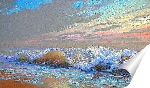 Описание плаката работа выполнена в ипресионистической манере пастозной техникой наложения света, под впечатлениемутреннего солнечного света, освещающего, облака, и создающего скользящий эфект отражения их в морской воде. набигающие волны, контрастирующие с топлими о
