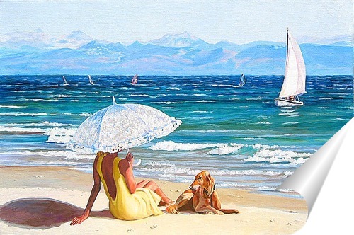 Описание плаката Берег океана, необъятного и чарующе прекрасного, вдалеке у горизонта тают в дымке горы. На берегу сидит девушка в легком летнем платье цвета песка в солнечный день, под белым кружевным зонтом, рядом с ней преданная собака, терпеливо ждет вместе с хоз