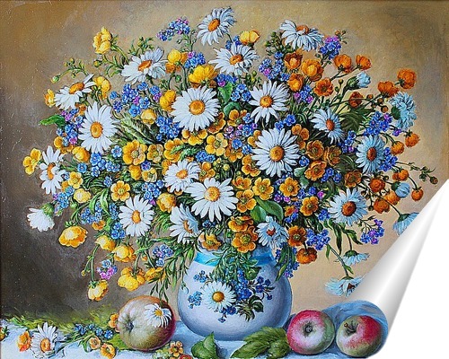Описание плаката Большой букет, составленный из летних лесных цветов: ромашек, жёлтых лютиков и голубых незабудок гармонично сочетающихся между собой. Цветочную композицию дополняют красно-зелёные яблоки. Картина идеально впишется в интерьер Вашей кухни.