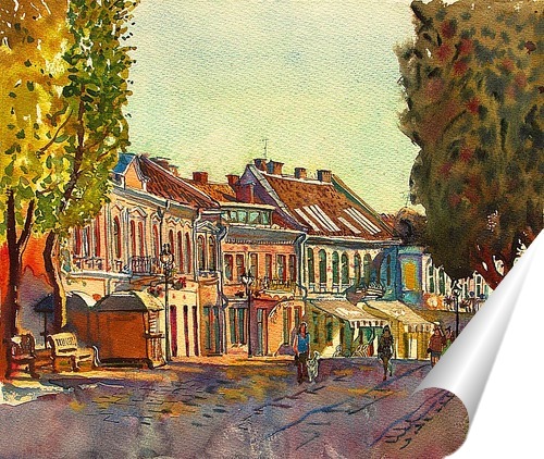 Описание плаката летний солнечный вечер, улочка Вильняус старого города Каунаса, Литва город, летняя жара, умиротворение, музыка улиц, прохожие оригинал: бумага/акварель 42 x 35,5 cm художник Наталия Михальчук, 2015 год