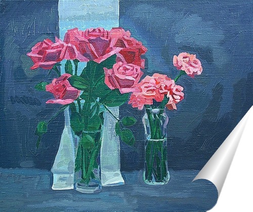Описание плаката Было два цветка.Одна роза и одна гвоздика.А также баночка,ваза,серая и белая тряпочки.С помощью постановки цветов в различные ракурсы был образован этот натюрморт.