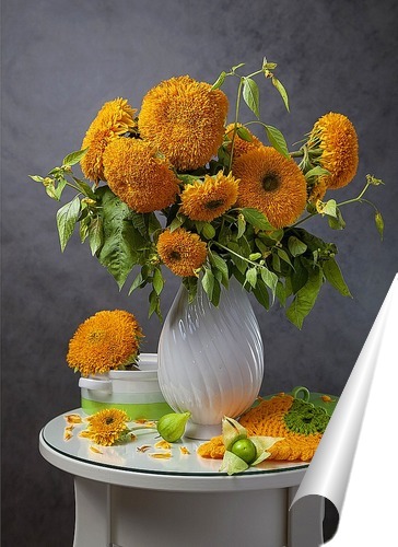 Описание плаката Специально выращивала именно такие подсолнухи, получила большое удовольствие работая с ними, очень фактурные. У меня этот натюрморт вызывает чувства: покоя, уюта, радости.