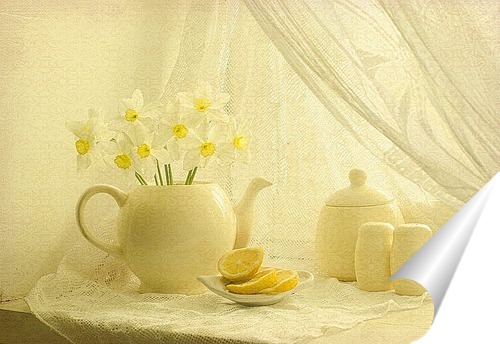 Описание плаката ***Погожий денек в мае вдохновил меня на этот натюрморт.Фото сделано в мягких нежных тонах,что неволей навевает спокойствие и умиротворение.***На фото всё подобрано в тон нарциссам.