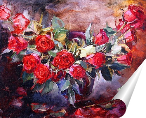 Описание плаката Букет темно-красных роз ,написан с натуры при дневном освящении в мастерской,вид сверху.Натюрморт создан летом 2013 году. Холст, масло,размер 50 на 60 сантиметров