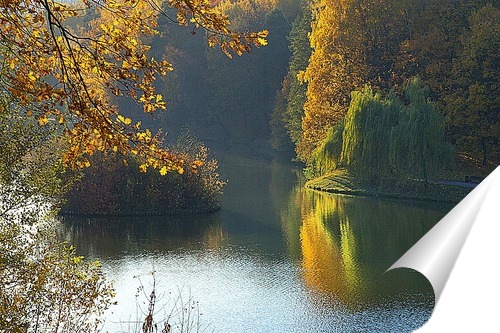 Описание плаката Улетают птицы за море, Миновало время жатв, На холодном сером мраморе Листья жёлтые лежат. Солнце спряталось за ситцевой Занавескою небес, Чёрно-бурою лисицею Под горой улёгся лес. По воздушной тонкой лесенке Опустился и повис Над окном