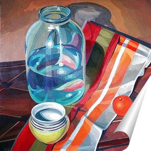 Описание плаката Натюрморт, выполнен темперными красками по бумаге.Очень хотелось передать игру цвета, теней и света. Натюрморт немного декоративный, как и задумывалось.