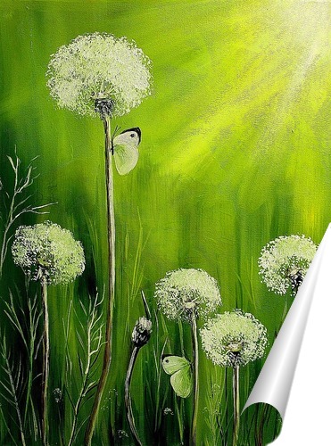 Описание плаката Прекрасная летняя пора. Бабочки порхают . Тонкие, воздушные одуванчики тянутся к солнышку. Позитивная живопись жизнеутверждающего зеленого цвета. Отличный подарок для поднятия настроения.