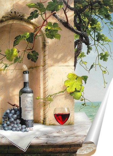 Описание плаката На картине изображена бутылка старого вина и виноград. В тени виноградника ощущается легкий прохладный бриз. Натюрморт на пленере - это всегда умиротворение и спокойствие.