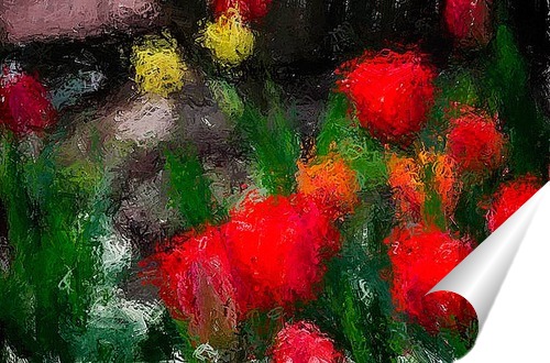 Описание плаката Снимок тюльпанов снят в моём саду после дождя и обработан под акварель.Яркие весенние цветы могут послужить украшением Вашего дома .Разноцветная палитра тюльпанов восхищает взор и радует душу.