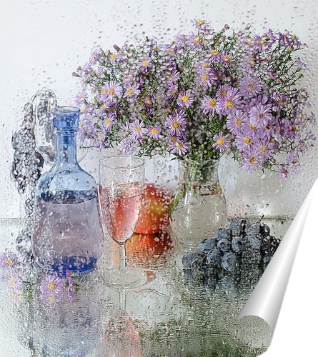 Описание плаката За окном дождь,а в Вашем доме тепло и уютно.Букет мелкоцветковых хризантем и немного фруктов украсят ваш дом и наполнят его прекрасным настроением.Такой постер украсит ваш дом.