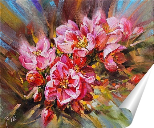 Описание плаката Картина маслом на холсте. Айва. 50x60 см. 2016 год написания картины. Художник Светлана Рогозина. На картине изображена ветка цветущего дерева айвы японской или хеномелеса. В теплом колорите.