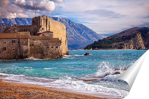 Описание плаката февраль 2015 года, город Будва,Черногория,вид на часть старого города,примыкающего к морю,части побережья и острова Святого Николая с пляжа Ричардова глава
