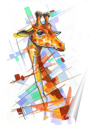 Описание плаката яркая картинка с жирафом, быстрые бодрые линии, смелые пятна цвета. зимой напомнит о солнышке, летом добавит динамичности среди зноя.