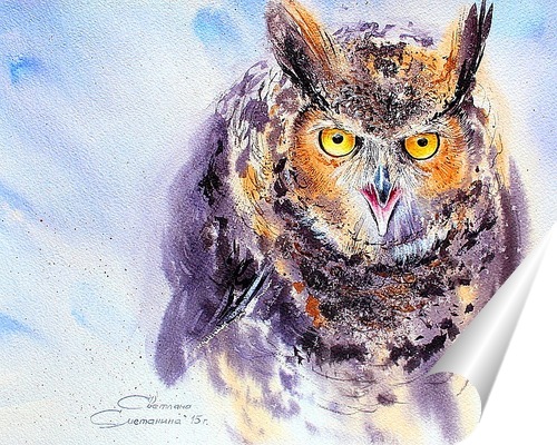 Описание плаката В лесах живут совы – Глазасты, большеголовы, Остры когти, клюв крючком, Видят ночью, как и днем. Каждый шорох совы слышат И охотятся на мышек. Нет какой-нибудь полевки – Так лягушку схватят ловко. (акварель, бумага)