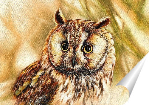 Описание плаката Работа выполнена в технике сухой пастели на пастельной бумаге. Изображена ушастая сова на абстрактном фоне. Реалистичное изображение. Анимализм. Ограниченная цветовая гамма.