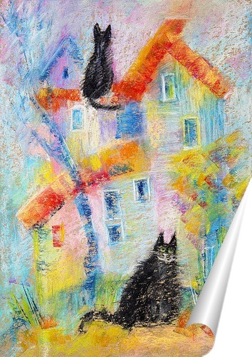 Описание плаката В каждом городе живут коты. Вот и в нашем сказочном городе коты тоже сказочные. Посмотрите, как важно они уселись и на земле, и на крышах. Улыбаясь, глядят они на вас. Улыбнитесь и вы.