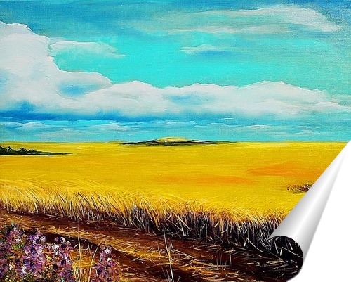 Описание плаката Русский пейзаж. Бескрайнее поле пшеницы , чистый воздух и ощущение счастья! Яркие, сочные краски и единение с природой.Прекрасный подарок в дом родным и близким.