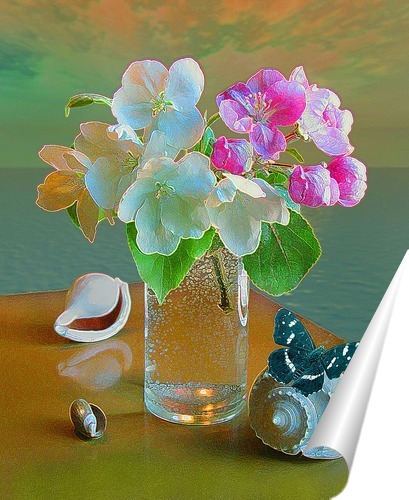 Описание плаката Натюрморт предлагает вниманию зрителя роскошные цветы яблони, раковины и прилетевшую черную бабочку. Фон-вечернее море, дает ощущение глубины пространства и не отвлекает внимание от переднего плана.