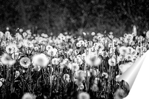 Описание плаката Пейзаж из одуванчиков. Небольшая прогулка обернулась неплохой арт фотографией. Поле с одуванчиками прекрасно вписывается в черно-белую стихию. Приятного просмотра