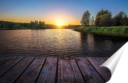 Описание плаката Закат на озере Селигер в Тверской области - огромное живописное озеро. Краски и цвета заката выглядят очень красиво.
