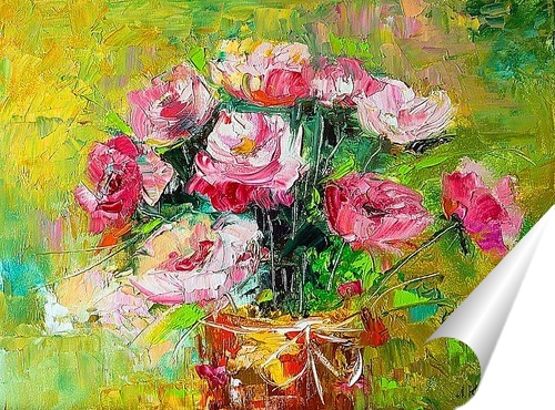 Описание плаката Работа москвоской художницы Любови Купцовой. выполнена маслом на холсте мастихином. Яркий, сочный букет роз придаст интерьеру нежности. яркости. Внесет атмосферу творчества и красоты.