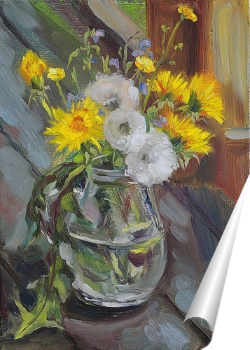 Описание плаката Красота этих цветов проста, но привлекательна. Как солнце, горят желтым цветом; как пух или снег, когда отцветают. Букет полевых цветов для тех, кто ценит красоту в простоте и естественности.