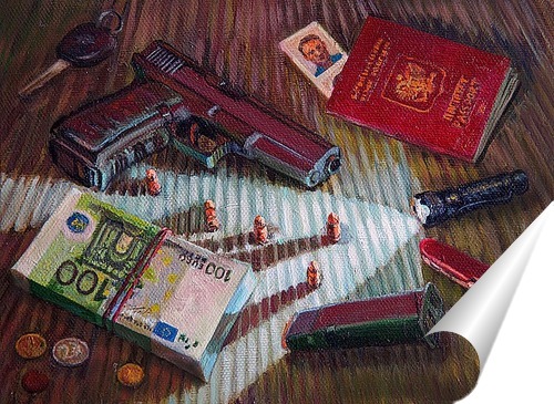 Описание плаката Картина "Глок 17 /Glock17 " ( другое название "Прорвусь по-любэ!") , 2015 год, холст-масло, 30 х 40 см Натюрморт с автоматическим пистолетом Глок-17 (Glock-17), навеянный остросюжетными фильмами. Отличный подарок мужчине интересующимся оружием. И