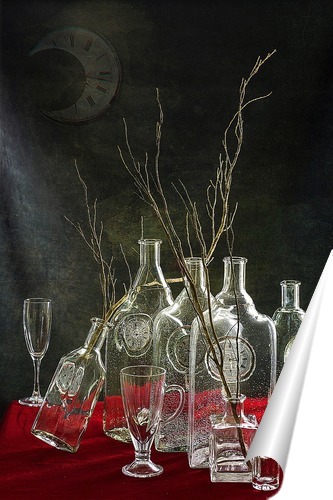 Описание плаката Натюрморт "Вечерний звон" представляет собой сюрреалистический сюжет с пустыми бутылками и часами. Это попытка заставить обычные предметы передать чувства и настроения, связанные с безвозвратно уходящим временем и наступившей ночью, которая может таи