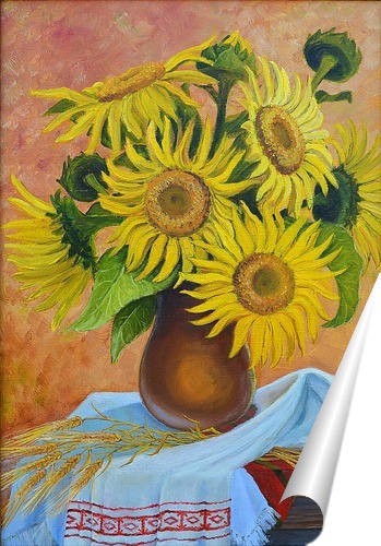 Описание плаката Букет подсолнухов - напоминание о солнышке, лете, радости! Подсолнухи на кухне - к достатку! А глиняный горшок и вышитое полотенце - это о наших деревенских корнях. Они есть у всех. Желаю вам счастья!
