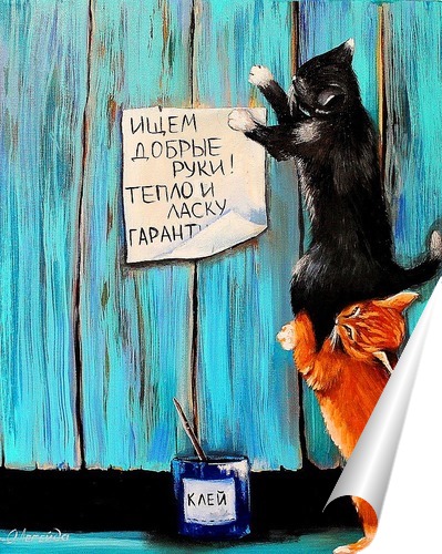 Описание плаката Прекрасный, милый сюжет. Котята ищут дом.Говорят , что человек сам кузнец своего счастья. Котята решили воспользоваться народной мудростью. от картины веет добром и светом.