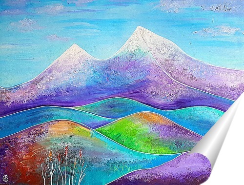 Описание плаката Авторская картина "Горы" выполнена яркими жизнеутверждающими красками, будет прекрасным украшением вашего интерьера, детской комнаты или подарком для любимого человека.