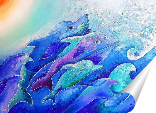 Описание плаката Авторская картина "Дельфины" выполнена яркими жизнеутверждающими красками, будет прекрасным украшением вашего интерьера, детской комнаты или подарком для любимого человека.