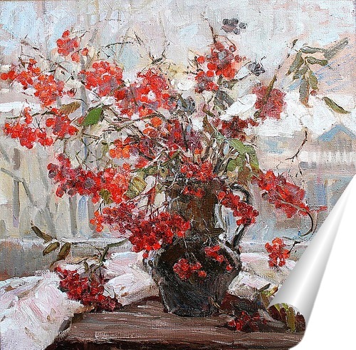 Описание плаката Трогательный сюжет - букет из веточек рябины и калины, стоящий на окне на фоне первого ноябрьского снега. Контрасты красных ягод и холодных оттенков пейзажа заставляют зрителей ощутить восторг от долгожданного первого снега.
