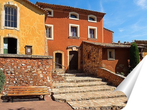 Описание плаката Руссийон (Roussillon) - городок (коммуна) в регионе Прованс-Альпы-Лазурный берег, департамент Воклюз, округ Апт. Руссийон находится в 39 километрах к юго-востоку от Авиньона. Весь Руссийон покрашен в цвета охры, которая раньше добывалась в каменоломн
