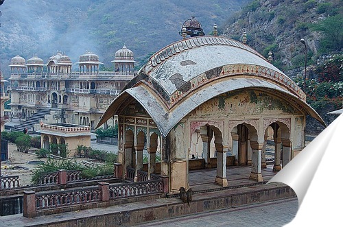 Описание плаката Храм обезьян не далеко от Джайпура. Джайпур, называемый «Розовым городом» из-за необычного розового цвета камня, использовавшегося в строительстве, был основан в 1727 году махараджей Дхундхара Савай Джай Сингхом II (годы правления 1699—1743) в качест