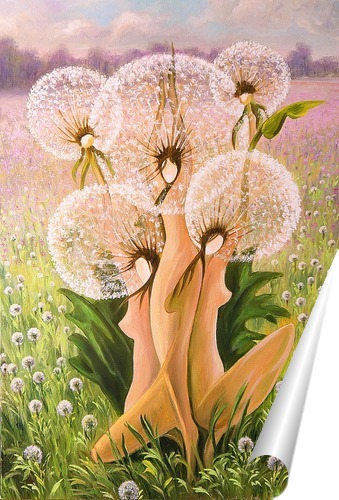 Описание плаката Волшебные и великолепные всеми любимые цветы одуванчики, выполненные в авангардном жанре, прочтенные в женском облике с обнаженными телами вместо стебельков. Что может быть интереснее для созерцания и осмысливания увиденного!