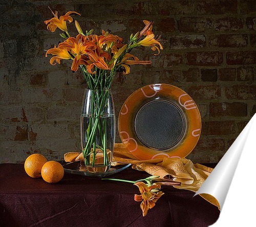 Описание плаката Классический натюрморт с оранжевыми лилиями и апельсинами выдержан в одной гамме .Такой постер может украсить любое помещение в вашем доме или квартире,а так же в отеле, ресторане, кафе.