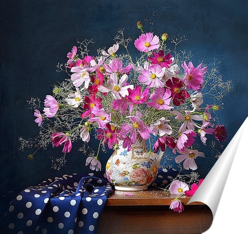 Описание плаката Букет из нежных белых, розовых и малиновых космей, всеми так любимых. Платок из благородного шелкового крепдешина - любимой ткани наших мам и бабушек.