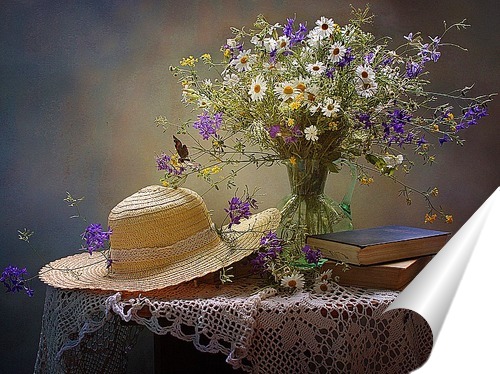 Описание плаката Беззаботный вечер на даче в компании букета полевых цветов и любимой книги - что может быть лучше? Шляпка и вязаная скатерть ручной работы дополняют композицию, придавая ей деревенский колорит.