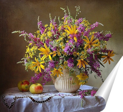 Описание плаката Букет из июльских цветов: дербенника, топинамбура, золотых шаров и желтых ромашек. Дачные яблоки. Хлопчатобумажная салфетка и ришелье 70-ых годов прошлого века.