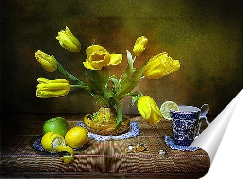 Описание плаката Прекрасный букет желтых тюльпанов,подаренных к празднику 8 марта. Тюльпаны - олицетворение весны, женского праздника и пробуждения природы. Натюрморт снят с использованием световой кисти.