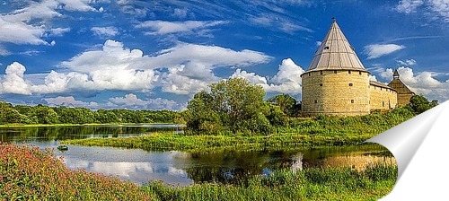Описание плаката В Старой Ладоге, на месте впадения речки Ладожки в Волхов, расположена древняя Староладожская крепость, построенная по всем правилам древнерусского фортификационного искусства. Могучие стены, башни — настоящая северная твердыня! В течении многих веко