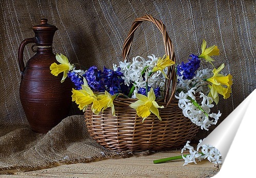 Описание плаката Натюрморт с первыми весенними цветами- нарциссами и гиацинтами. Такой постер украсит любое помещение в вашем доме или квартире и создаст в них весеннее солнечное настроение.