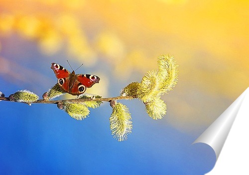 Описание плаката пара красивых бабочек павлиний глаз собирают нектар весной с пушистых веток вербы. пара красивых бабочек павлиний глаз собирают нектар весной с пушистых веток вербы.