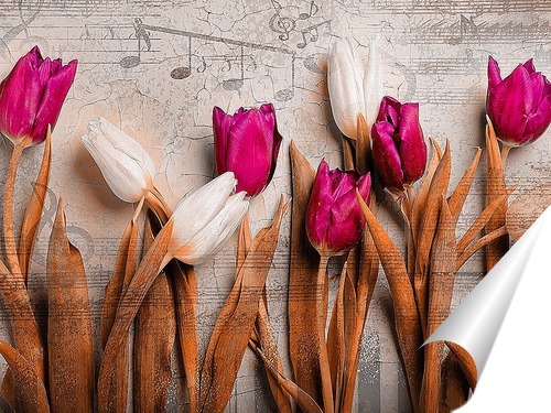 Описание плаката Картина с изображением ярких бардовых и белоснежных тюльпанов на винтажном фоне станет главным украшением любой комнаты.