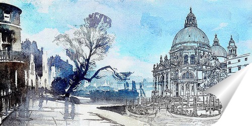 Описание плаката Даже дождливая погода в Венеции прекрасна! Собор Санта-Мария делла Салюте в акварельном пейзаже Венеции - для влюблённых в этот город!