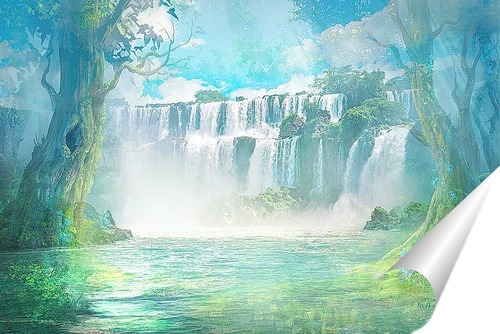 Описание плаката Изображение в интерьере прекрасного большого водопада среди деревьев в лесу станет прекрасным дополнением вашей комнаты.