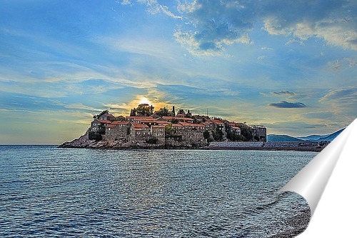 Описание плаката Остров Святой Стефан в Черногории. В настоящее время остров представляет собой отель.