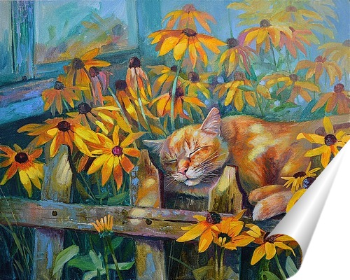 Описание плаката Рыжие цветы, рыжий кот - всё совпало. Пусть восходящее солнце не потревожит усталого кота :)