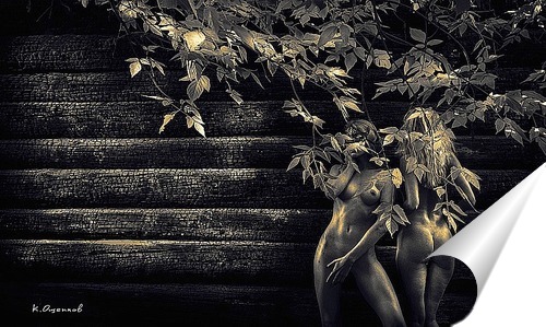 Плакат "Две девушки на фоне бревенчатой стены в листве"